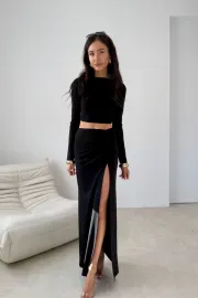Linnea to bluzka o minimalistycznym, nowoczesnym charakterze, która doskonale podkreśla kobiecą sylwetkę. Dopasowany model z długim rękawem wyróżnia się krótszym fasonem, który subtelnie eksponuje talię i świetnie komponuje się z dopasowanymi spódnicami lub spodniami z wysokim stanem. Wykonana z elastycznego materiału, który komfortowo dopasowuje się do ciała i podkreśla linię sylwetki.