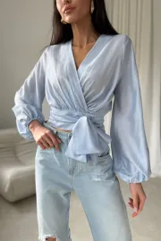 Nerina – kopertowa bluzka wiązana w talii, długi rękaw, błękitna | Roco Fashion