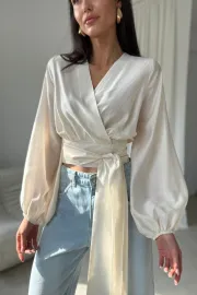 Nerina to bluzka o eleganckim, kopertowym kroju, który subtelnie układa się na sylwetce. Model wyróżnia się wiązaniem w talii podkreślającym kobiece proporcje oraz luźnymi rękawami zakończonymi gumką, które dodają lekkości i swobody. Krótsza forma harmonijnie współgra z dolną częścią stylizacji, tworząc nowoczesny i wyrafinowany look.