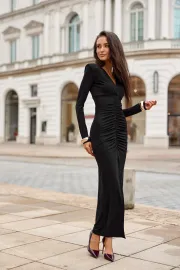 Eloria to elegancka czarna długa sukienka, która pięknie podkreśla sylwetkę. Jej charakter wyznacza dekolt V-neck, subtelne marszczenie biegnące wzdłuż linii środkowej oraz efektowne rozcięcie z przodu, które dodaje lekkości i zmysłowości. Poduszki na ramionach wprowadzają nowoczesny akcent. Uszyta w Polsce, co gwarantuje wysoką jakość wykonania i dbałość o detale.