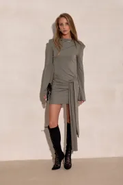 • Nevira – brązowa mini sukienka z drapowaniem i wiązaniem