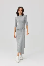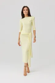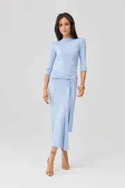 Lidiana to sukienka o nowoczesnym, kobiecym charakterze, zaprojektowana z myślą o podkreśleniu sylwetki. Model wyróżnia się dopasowanym fasonem, długością midi oraz efektownym wiązaniem w talii, które subtelnie akcentuje proporcje figury. Całość dopełnia elastyczny materiał i rękawy o długości 3/4, zapewniające komfort oraz elegancką linię.