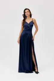 Salma to sukienka wieczorowa o szykownej, wydłużonej linii, która pięknie podkreśla sylwetkę. Model zachwyca subtelnym V-dekoltem, delikatnymi ramiączkami oraz długą, swobodnie układającą się spódnicą z efektownym rozcięciem. Gładki fason akcentuje talię w elegancki, nowoczesny sposób.